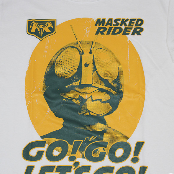 初代仮面ライダー1号のマスクのアップにGO!GO!LETS GO!の文字を配置したシンプルかつ大胆なデザインのTシャツです!わざと傷がついているようにデザインしし、ヴィンテージ感を出しています。