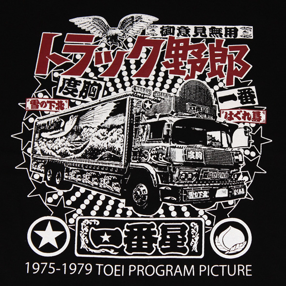 1975年から1979年にかけて10作が制作、公開された東映の人気シリーズ映画をTシャツにしました!桃さんの愛車「一番星号」をドドーンとプリント!1作ごとにデザインの異なる「一番星号」ですがこれは9作目「熱風5000キロ」の時のものです。とび魚の箱絵が特徴の11tトラックです!左袖には東映オフィシャルデザインのトラック野郎40th soonマークもプリントしてあります!