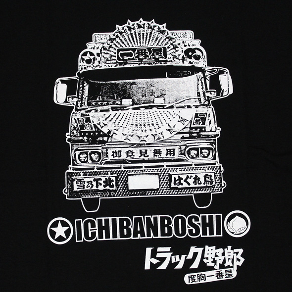 「トラック野郎」シリーズ5作目!「度胸一番星」に登場した一番星号デザインの半袖Tシャツです。長袖Tシャツやジップパーカーで好評だったため今回半袖Tシャツでも登場です!前面にはアーチになった星形マーカーが特徴的な一番星号のフロントマスクをプリント。そして背中にはトラックの後部観音扉に施されている桃太郎&鬼のアートに行灯のデザインを組み合わせてプリントしてあります!