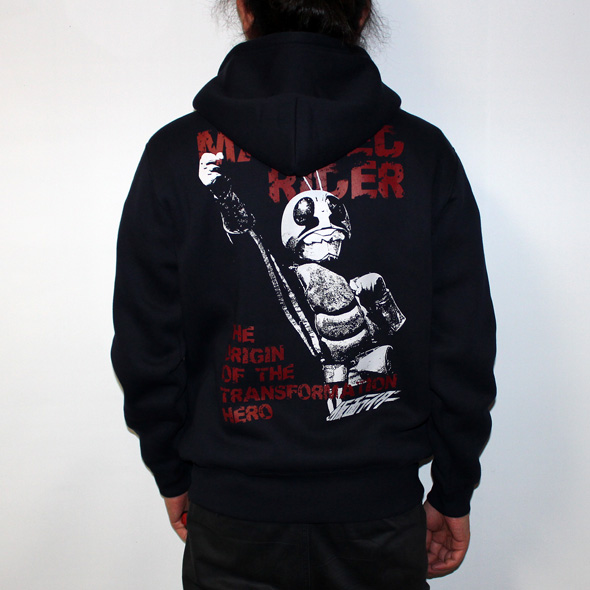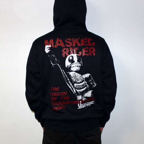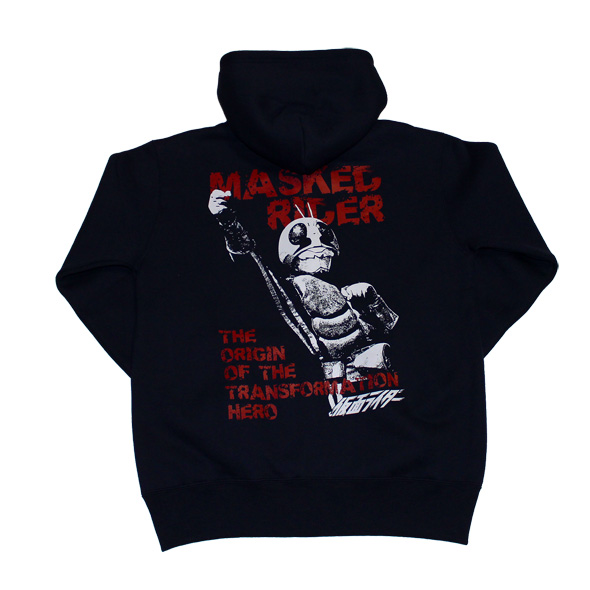 旧一号ライダーから大幅に変更されたカラーリングがスタイリッシュでよりヒーローとしてのカッコよさを感じさせてくれた新一号ライダー!そんな新一号ライダーをシンプルに配置し着やすいデザインにしています。パーカーは裏起毛で肉厚なジップアップタイプです!