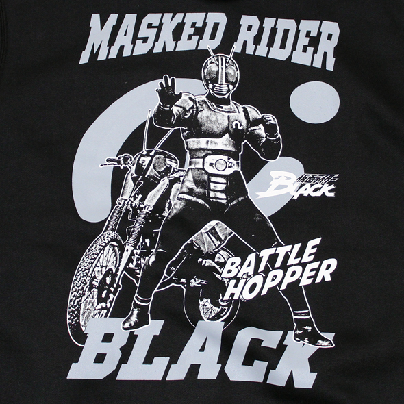 暗黒結社ゴルゴムにより「太陽の石」を持つ世紀王として改造されたブラックサン。ブラックサンは脳改造手術の前に脱出し「仮面ライダーBLACK」としてゴルゴムと戦う事となる。また世紀王専用マシンとしてゴルゴムにより開発された、意思を持つ生体メカ「バトルホッパー」!自ら盾となりBLACKを守るなど両者は友情で結ばれている。クールなデザインとストーリー性で人気の高い「仮面ライダーBLACK」のパーカーが登場です!ボディは裏起毛で肉厚なジップアップタイプです!