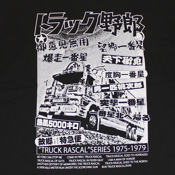 第3作目「望郷一番星」の一番星号を背景に「トラック野郎」シリーズ全10作のサブタイトルがドーンとプリントされています!英字で書かれているのは海外タイトルです!「TRUCK RASCAL SERIES」(トラック野郎シリーズ)のメインタイトルの他、全10作の英タイトルもプリントされています!