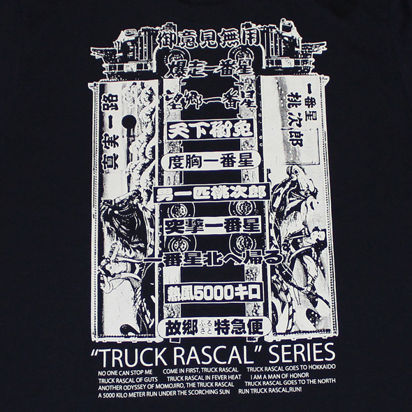 前面には第6作目「男一匹桃次郎」バージョンの一番星号とジョナサン号のフロントマスクを!この一番星号は兜を模したデザインのマーカーパネルが特徴的です!背にはこの一番星号の両サイド!そしてシリーズ全10作のサブタイトルが公開順にプリントしてあります!すらすらと全部言えるようになって「トラック野郎」マニアになりましょう!