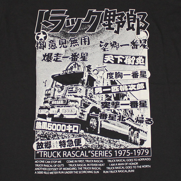 第3作目「望郷一番星」の一番星号を背景に「トラック野郎」シリーズ全10作のサブタイトルがドーンとプリントされています!英字で書かれているのは海外タイトルです!「TRUCK RASCAL SERIES」(トラック野郎シリーズ)のメインタイトルの他、全10作の英タイトルもプリントされています!袖口はリブの付いた実用的かつスタイリッシュなデザインのロングスリーブTシャツです!