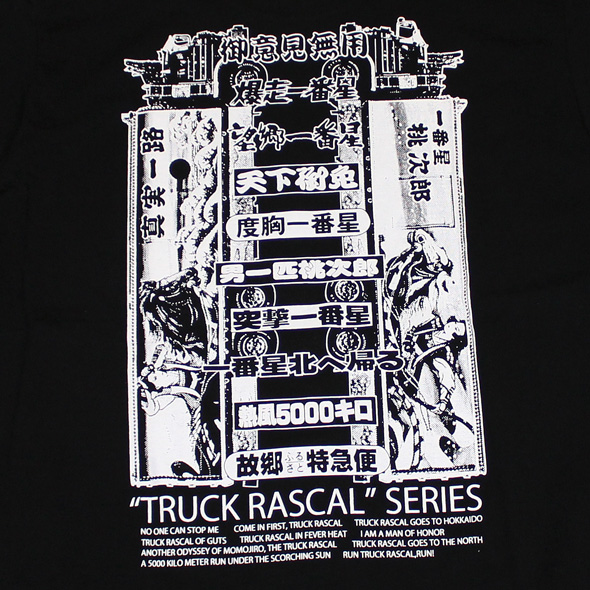 前面には第6作目「男一匹桃次郎」バージョンの一番星号とジョナサン号のフロントマスクを!この一番星号は兜を模したデザインのマーカーパネルが特徴的です!背にはこの一番星号の両サイド!そしてシリーズ全10作のサブタイトルが公開順にプリントしてあります!すらすらと全部言えるようになって「トラック野郎」マニアになりましょう!