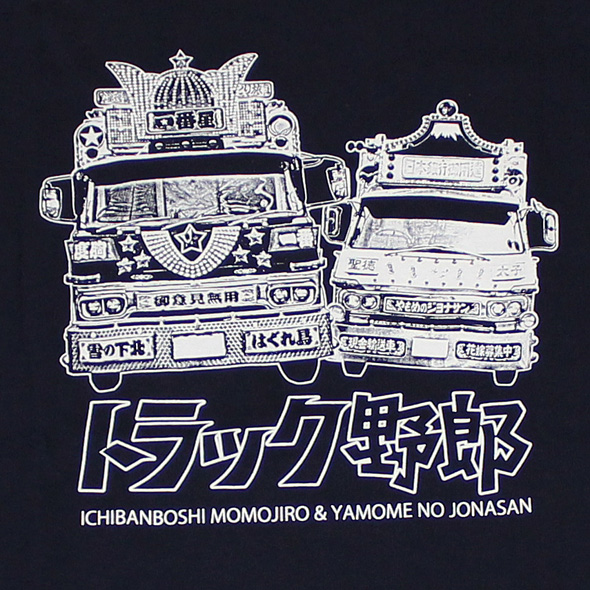 商品説明: 前面には第6作目「男一匹桃次郎」バージョンの一番星号とジョナサン号のフロントマスクを!この一番星号は兜を模したデザインのマーカーパネルが特徴的です!背にはこの一番星号の両サイド!そしてシリーズ全10作のサブタイトルが公開順にプリントしてあります!すらすらと全部言えるようになって「トラック野郎」マニアになりましょう!