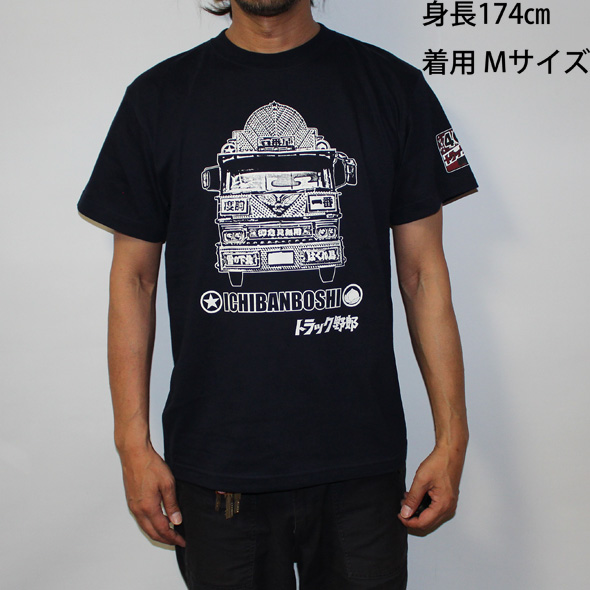 商品説明: 「トラック野郎」最終作(故郷特急便)の一番星号の正面をTシャツ前面に。そして背中には斜めからの迫力ある姿と行灯のデザインをドドンとプリントしてあります。イベントなどでもバッチリ目立ちますよ!