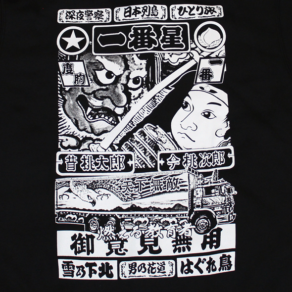 「トラック野郎」シリーズ5作目!「度胸一番星」に登場した一番星号デザインのジップパーカーです。左胸にはアーチになった星形マーカーが特徴的な一番星号のフロントマスクをプリント。そして背中にはトラックの後部観音扉に施されている桃太郎&鬼のアートに行灯のデザインを組み合わせてプリントしてあります!裏起毛で暖かい肉厚のジップパーカーです!