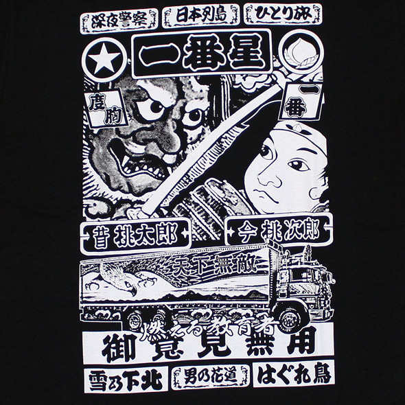 商品説明: 「トラック野郎」シリーズ5作目!「度胸一番星」に登場した一番星号デザインの半袖Tシャツです。長袖Tシャツやジップパーカーで好評だったため今回半袖Tシャツでも登場です!前面にはアーチになった星形マーカーが特徴的な一番星号のフロントマスクをプリント。そして背中にはトラックの後部観音扉に施されている桃太郎&鬼のアートに行灯のデザインを組み合わせてプリントしてあります!