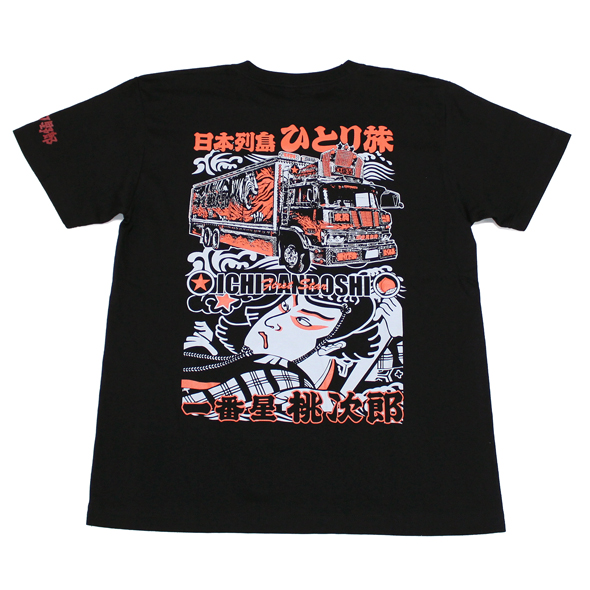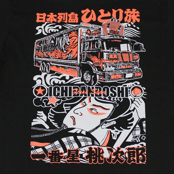 シリーズ8作目「一番星北へ帰る」に登場の一番星号を前後にドドンとド派手にプリント!前面には一番星号のマスクを2色プリントでいつもより少し大きめに入れています。インパクト満点の背中には、白虎のペイントがカッコいい運転席側のサイドビューと、助手席側の歌舞伎モチーフのペイントを組み合わせてデザインしてあります。