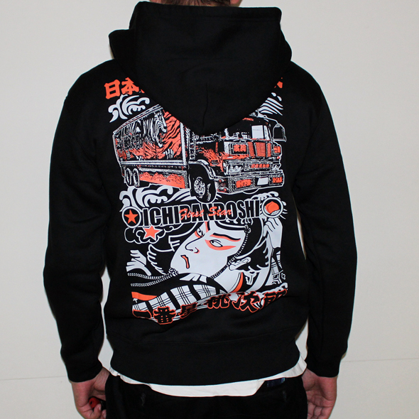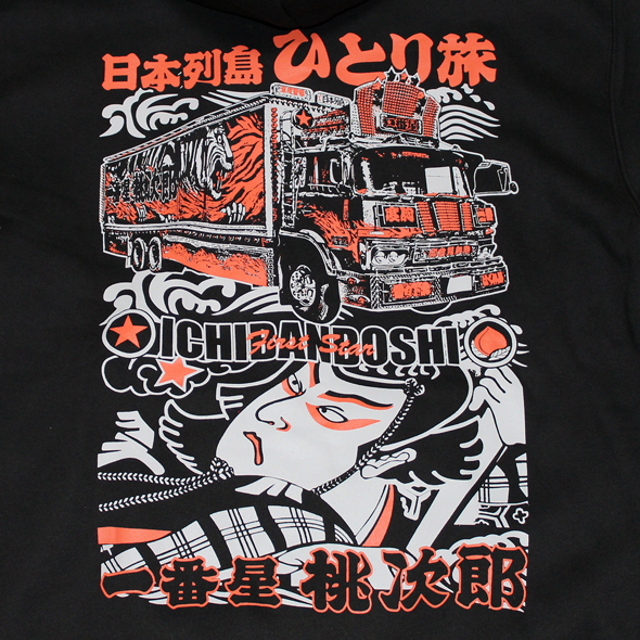 シリーズ8作目「一番星北へ帰る」に登場の一番星号を前後にドドンとド派手にプリント!前面には一番星号のマスクを2色プリントでいつもより少し大きめに入れています。インパクト満点の背中には、白虎のペイントがカッコいい運転席側のサイドビューと、助手席側の歌舞伎モチーフのペイントを組み合わせてデザインしてあります。裏起毛で暖かい肉厚のジップパーカーです!