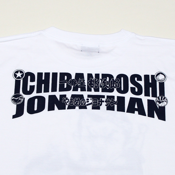シリーズ3作目「望郷一番星」の台本の表紙に描かれたイラストをプリントしたTシャツです!あまり一般的にみかける事のない台本の表紙に描かれたイ単色イラストですが躍動感があって楽しさの伝わってくる素晴らしいイラストです。「望郷一番星」と「東映株式会社東京作品」の文字も台本に書かれていたままです。イラストの一部や文字の一部のプリントがかすれているのも古い台本を元にしているためです。背中には仲良くICHIBANBOSHIとJONATHANのロゴが並んでプリントしてあります。