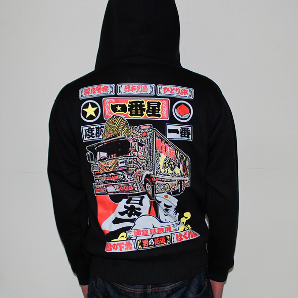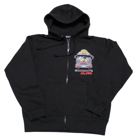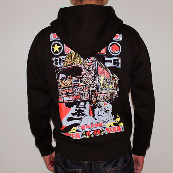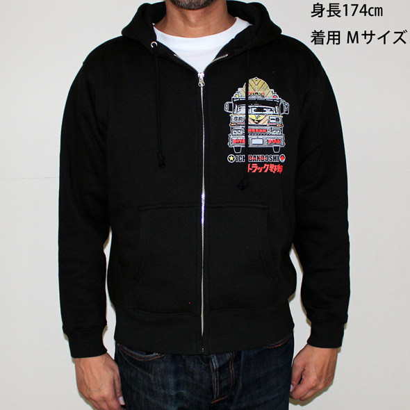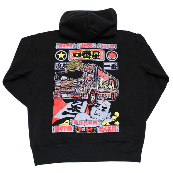 商品説明: Tシャツで好評の「トラック野郎」最終作(故郷特急便)一番星号デザインのジップパーカーです!左胸には一番星号の正面からの姿を!背面には斜めからの姿と観音扉の絵をプリントしています!ボディは裏起毛で肉厚なジップアップタイプです!