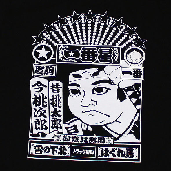 1975年から1979年にかけて10作が制作、公開された東映の人気シリーズ映画をTシャツにしました!桃さんの愛車「一番星号」の観音扉の箱絵とトラックのフロント部分の行燈をデザイン化して組み合わせてあります。「一番星号」の前と後が同時に楽しめるというわけです。左袖には東映オフィシャルデザインのトラック野郎40th soonマークもプリントしてあります!