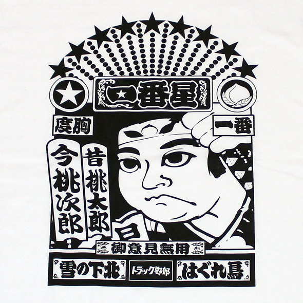 1975年から1979年にかけて10作が制作、公開された東映の人気シリーズ映画をTシャツにしました!桃さんの愛車「一番星号」の観音扉の箱絵とトラックのフロント部分の行燈をデザイン化して組み合わせてあります。「一番星号」の前と後が同時に楽しめるというわけです。左袖には東映オフィシャルデザインのトラック野郎40th soonマークもプリントしてあります!